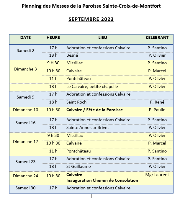 Présentation PPlanning des messes de la paroisse Sainte-Croix-De-Montfort Septembre 2023 Attention ! Il n’y a qu’une seule messe au Calvaire pour les dimanches 10 et 24 Septembre Partager : Partager sur Facebook(ouvre dans une nouvelle fenêtre) Facebook Partager sur X(ouvre dans une nouvelle fenêtre) X Imprimer(ouvre dans une nouvelle fenêtre) Imprimer Email a link to a friend(ouvre dans une nouvelle fenêtre) E-mail J’aime chargement…