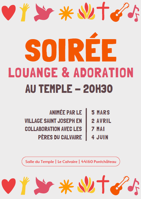 Vous êtes chaleureusement invités à la soirée de louange et d’adoration qui aura lieu chaque premier mardi du mois, à 20h30